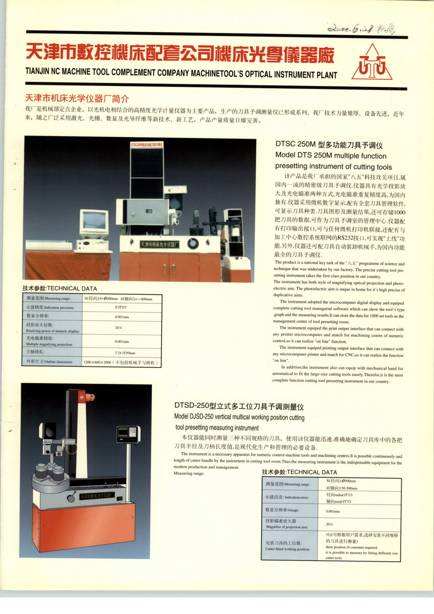 我廠為天津市數(shù)控機(jī)床配套有限公司機(jī)床光學(xué)儀器廠,是1969年由天津市機(jī)床工具研究所轉(zhuǎn)制的集光、機(jī)、電一體的技術(shù)密集型企業(yè)。本企業(yè)擁有先進(jìn)的技術(shù),精良的設(shè)備,完善的測(cè)試手段和可靠的質(zhì)量保證體系。我廠有完整的機(jī)械設(shè)計(jì)加工能力,光學(xué)設(shè)計(jì)制造能力,電氣設(shè)計(jì)試驗(yàn)?zāi)芰?,是?guó)家二級(jí)計(jì)量單位,國(guó)家技術(shù)監(jiān)督局頒發(fā)的《制造計(jì)量器具許可證》,機(jī)械、光學(xué)、電氣設(shè)計(jì)工作均由高級(jí)工程師主持完成,保證了產(chǎn)品的先進(jìn)性,質(zhì)量的可靠性。我廠開發(fā)研制的產(chǎn)品分別榮獲新產(chǎn)品獎(jiǎng)、天津市新產(chǎn)品二等獎(jiǎng)、天津市科技進(jìn)步等獎(jiǎng),天津市優(yōu)質(zhì)產(chǎn)品稱號(hào)等。我們分別參加了國(guó)家“七五”和“八五”規(guī)劃中《多功能數(shù)控刀具預(yù)調(diào)儀的研究》課題的研制工作(國(guó)家三級(jí)合同)并圓滿完成任務(wù)。通過組織專家的審評(píng),認(rèn)為我廠研制的機(jī)外刀具預(yù)調(diào)測(cè)量?jī)x達(dá)到國(guó)際同期先進(jìn)水平,完全可以替代進(jìn)口產(chǎn)品,我廠產(chǎn)品為機(jī)、光、電一體化產(chǎn)品,技術(shù)含量高,具有一定的先進(jìn)性,產(chǎn)品銷售覆蓋全國(guó)各地部分產(chǎn)品銷往歐、亞、美地區(qū),在國(guó)內(nèi)外有一定的盛譽(yù)。