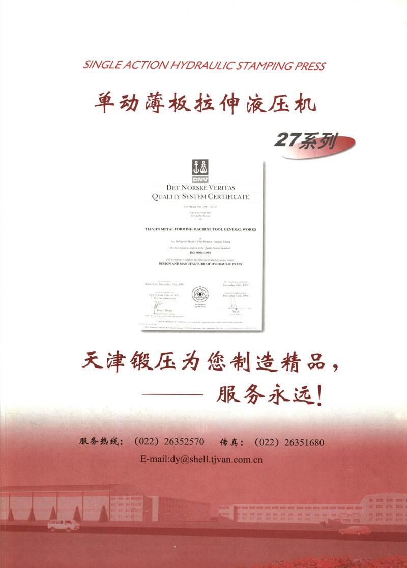 天津市鍛壓機(jī)床總廠是我國(guó)起步最早的企業(yè),現(xiàn)有固定資產(chǎn)2.4億元各類專業(yè)技術(shù)人員480人,是機(jī)械部大型骨干企業(yè)。自我廠自行設(shè)計(jì)國(guó)內(nèi)第一臺(tái)液壓機(jī),開創(chuàng)了我國(guó)中小型液壓機(jī)生產(chǎn)歷史以來(lái),目前擁有26個(gè)系列,300余品種,產(chǎn)品從80KN至5000KN,以形成年產(chǎn)1200臺(tái)各類液壓機(jī)的生產(chǎn)能力,居國(guó)內(nèi)同行業(yè)之首。1983年YT32-315四柱液壓機(jī)獲國(guó)家銀牌,1990年YT32-630/1030雙動(dòng)力拉伸液壓機(jī)一舉榮獲同行業(yè)唯一的國(guó)家金獎(jiǎng)另有部?jī)?yōu)產(chǎn)品3項(xiàng),市優(yōu)產(chǎn)品5項(xiàng)。產(chǎn)品廣泛適用于汽車制造、粉末冶金、金屬冷擠、輕工家電、化工機(jī)戒、航空航天、模具磨料、機(jī)戒制造等行業(yè),被國(guó)家指定為替代進(jìn)口產(chǎn)品,行銷全國(guó),產(chǎn)品出口到日本、荷蘭、東南亞等20多個(gè)地區(qū)和國(guó)家、市場(chǎng)占有率居全國(guó)同行業(yè)第一。