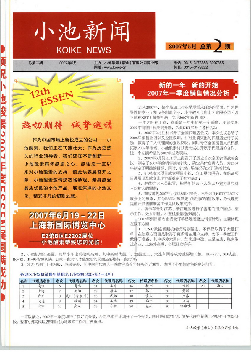 小池酸素系列產(chǎn)品自上世紀(jì)六十年代進(jìn)入中國,經(jīng)過多年不懈努力,小池酸素切割設(shè)備已經(jīng)廣泛應(yīng)用干中國的造船業(yè)、橋梁、工程機(jī)械、金屬加工業(yè)等許多相關(guān)行業(yè),尤其在造船行業(yè),小池酸素切割機(jī)是大部分船廠下料的主力軍。小池酸素在中國有近30家代理機(jī)構(gòu),除唐山本部外,在上海、北京、廣州等地均設(shè)有技術(shù)服務(wù)中心,為廣大用戶提供及時(shí)周到的售前、售中和售后服務(wù)。小池酸素系