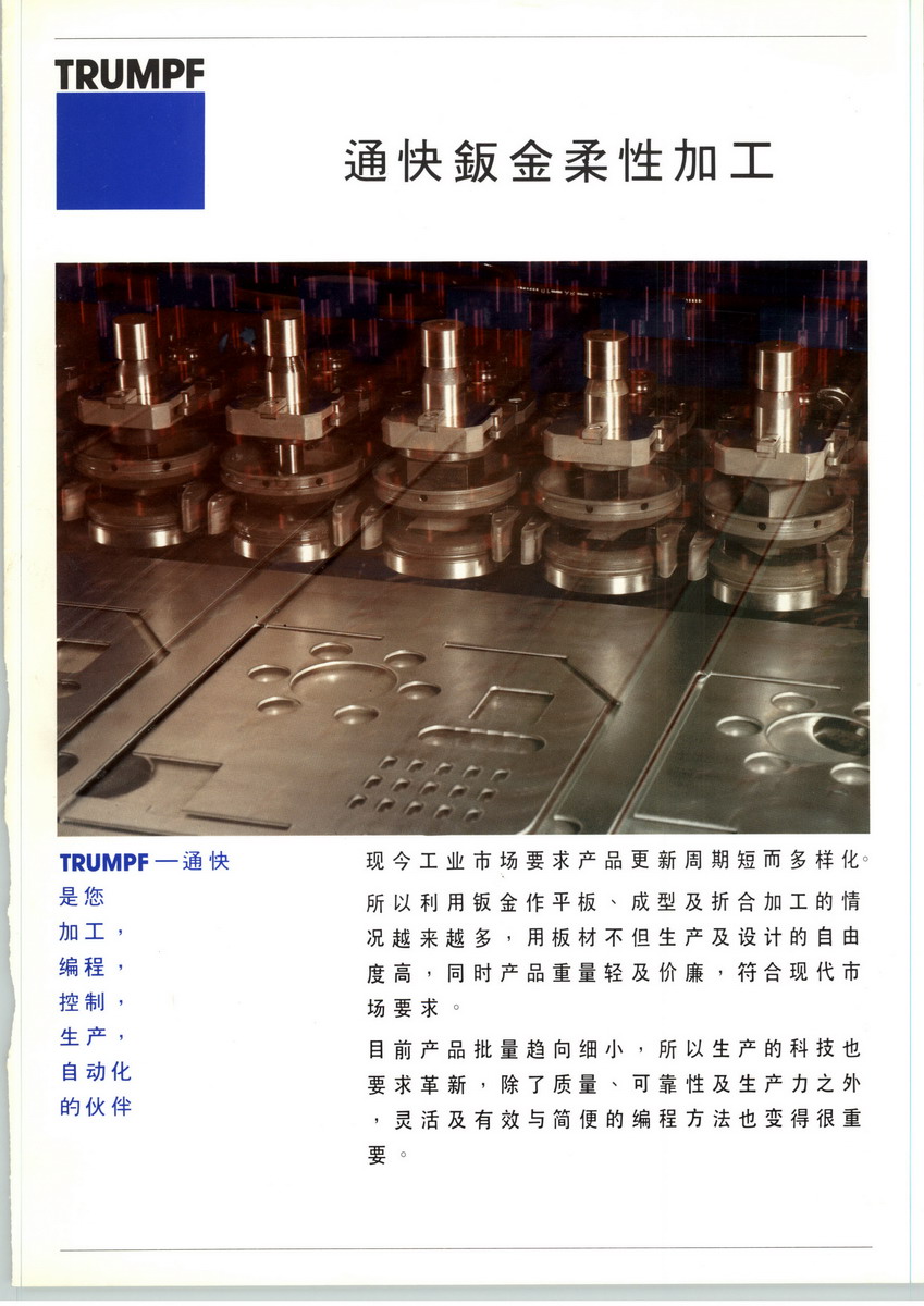 通快(中國)有限公司是通快集團(tuán)下屬的五十多個子公司之一,自2000年開始在中國的直接投資,先后在江蘇太倉與廣東東莞投資了四家生產(chǎn)化企業(yè),生產(chǎn)數(shù)控鈑金加工機(jī)床。通快集團(tuán)總部在德國迪琴根具有80多年的機(jī)床生產(chǎn)歷史,是全球制造技術(shù)領(lǐng)域的領(lǐng)導(dǎo)企業(yè)之一。從加工金屬薄板和材料的機(jī)床,到激光技術(shù)、電子領(lǐng)域,通快正以不斷的創(chuàng)新引導(dǎo)著技術(shù)發(fā)展趨勢。通快正在建立新的技術(shù)標(biāo)準(zhǔn),同時致力于開辟更新更多的產(chǎn)品給廣大用戶。通快(中國)有限公司注冊資本1608萬歐元,目前主要生產(chǎn)平面激光機(jī)床和配件,并將逐步開始數(shù)控激沖床和數(shù)控折彎機(jī)的生產(chǎn)。為實現(xiàn)通快機(jī)床在中國的迅猛發(fā)展,集團(tuán)投資2500多萬歐元興建一座面積逾40000平方米的現(xiàn)代新廠房,一期廠房于2009年8月正式投入使用,二期廠房也已于2011年11月投入使用。我們的目標(biāo)是將太倉總部建設(shè)成成為通快亞太區(qū)的生產(chǎn)、研發(fā)和服務(wù)中心,對通快在亞洲的銷售、生產(chǎn)、服務(wù)與應(yīng)用提供強(qiáng)有力的支持。通快(中國)有限公司同時負(fù)責(zé)通快全球產(chǎn)品在中國的銷售及售后服務(wù)支持業(yè)務(wù)。在上海、北京、東莞、成都及全國二十多個城市均設(shè)有銷售及售后服務(wù)網(wǎng)點,并分別在上海、深圳與太倉設(shè)有備件倉庫。目前已經(jīng)在中國安裝的機(jī)床數(shù)量超過2000臺。