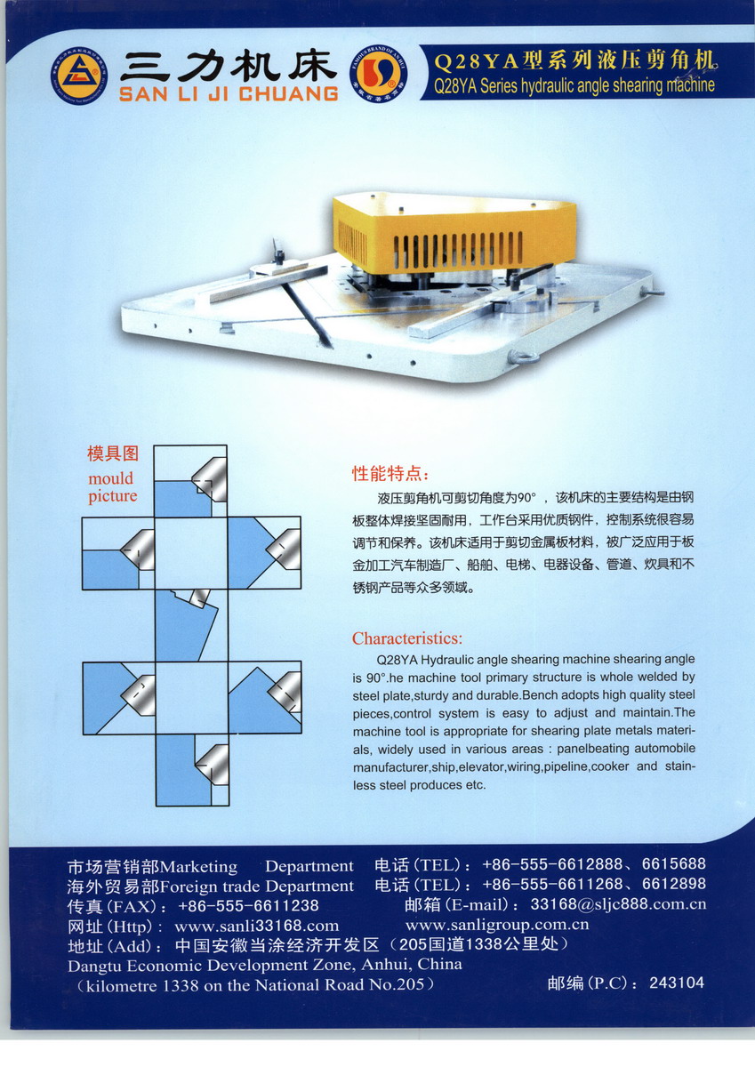 安徽省三力機床制造股份有限公司,屬安徽省名牌、免檢產(chǎn)品生產(chǎn)企業(yè),安徽省民營科技企業(yè),馬鞍山市“專、精、特、新”企業(yè),馬鞍山市下崗失業(yè)職工再就業(yè)基地,介于南京、蕪湖之間,坐落在著名的鋼城馬鞍山市,豐富的鋼鐵資源為公司的發(fā)展提供了得天獨厚的優(yōu)勢。公司占地面積108000平方米。生要生產(chǎn)“大盛”牌系列折彎機、剪板機、卷板機、液壓多功能快速壓力機、液壓多功能聯(lián)合沖剪機、剪角機、 龍門剪、鱷魚剪、 薄板開槽機、開卷校平機、型材彎曲機、刀具模具等產(chǎn)品,專業(yè)為航空、輕工、冶金、化工、建筑、汽車、電力、連條、裝潢等行業(yè)提供所需要的專用機械和成套設(shè)備,產(chǎn)品銷往全國各地和歐盟、東南亞地區(qū)并遠銷南非等世界各國,本公司產(chǎn)品系國家名牌產(chǎn)品(本公司安徽省三力機床制造股份有限公司是剪板機、折彎機、壓力機、聯(lián)合沖剪機的國家標準起草單位)。(起草單位:安徽省三力機床制造股份有限公司、 上海沖剪機床廠、天水鍛壓機床有限公司、佛山市南海力豐機床有限公司、沈陽鍛壓機械有限公司、湖北三環(huán)鍛壓設(shè)備有限公司) 公司用現(xiàn)代企業(yè)的管理方法,立足于產(chǎn)品的質(zhì)量管理,以其優(yōu)秀的品質(zhì),新穎的設(shè)計,合理的價格,完善的售后服務(wù)贏得了廣大客戶充分信賴和一致好評,被評為國家“重合同,守信用先進單位”、安徽省“著名商標”、安徽省“名牌產(chǎn)品”、安徽省農(nóng)行“AAA級信用企業(yè)”、安徽省“優(yōu)秀誠信民營企業(yè)”、“全國用戶產(chǎn)品質(zhì)量滿意,售后服務(wù)滿意示范單位”、“AAA級質(zhì)量誠信會員單位”、“中國質(zhì)量過硬放心品牌”、“中國市場公認暢銷品牌”、“全國機床十佳名優(yōu)品牌”等榮譽稱號。全體員工以先進的技術(shù)和現(xiàn)代化的管理手段為追求產(chǎn)品的完美而不懈努力。公司于2007- 2016年連續(xù)全面通過國際CE認證2001-2016年連續(xù)全面通過ISO9001:2000質(zhì)量管理體系認證,2003-2016年連續(xù)擁有自營進出口權(quán)。為提高產(chǎn)品科技含量及產(chǎn)品性能,2003年12月公司與合肥工業(yè)大學合作成立了“機床工程技術(shù)研究中心”。2004年WF67K數(shù)控板料折彎機新品生產(chǎn)線項目被省發(fā)展改革委員會批準為“三高”項目,并被列入省“861”計劃重點建設(shè)項目。三力產(chǎn)品精益求精,三力人將不斷開拓,不斷創(chuàng)新,并真誠地愿與各界朋友攜用共進,共同發(fā)展。