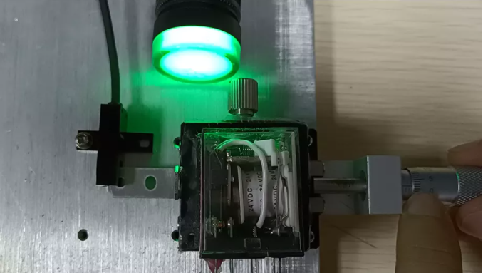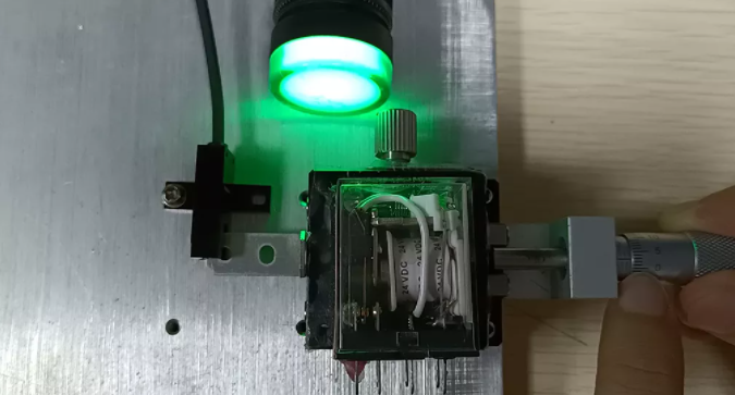 這里有一個(gè)重復(fù)精度測試儀器,我們可以通過旋動(dòng)標(biāo)尺推動(dòng)另一端的物塊前進(jìn),直到傳感器發(fā)出信號(hào),此時(shí)我們記錄下這個(gè)標(biāo)尺的位置。
