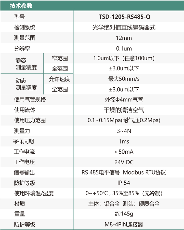 TSD-1205-RS485-Q 氣動款,連接直徑4毫米氣管,使用氣壓范圍1~1.5mpa,通氣時探桿將被推出,伸出進(jìn)行測量,這款接觸位移傳感器量程12.5mm,重復(fù)精度0.5um,測量精度可達(dá)3um,滿足工業(yè)大部分測量需求。